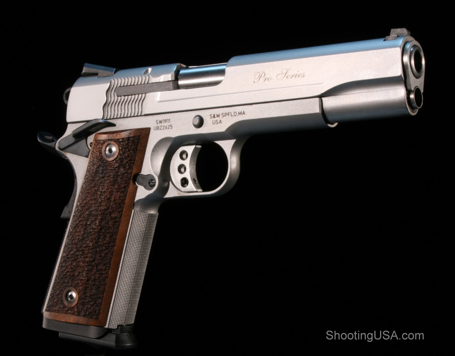 S&W 1911 Pro in 9mm John went with a Smith and Wesson 1911 Pro Series , chambered in nine millimeter, with ten plus one capacity. It has front and rear white dot sights. John blacked his out for the competition. And he added the mag-well base to help him in the prone position. Both the slide and frame are stainless steel with a matte silver finish.