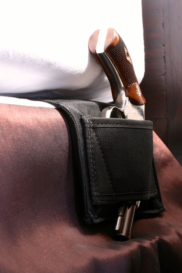 The Blackhawk! Bedside Holster has a panel you insert between the mattress and box spring. It’s a secure mount for most handguns – a Smith & Wesson J Frame fits nicely – to be close at hand, under the covers, for a night emergency. The Blackhawk Bedside Holster is under $35 suggested retail. ($31.45 bought through the Shooting USA Blackhawk! discount link.)